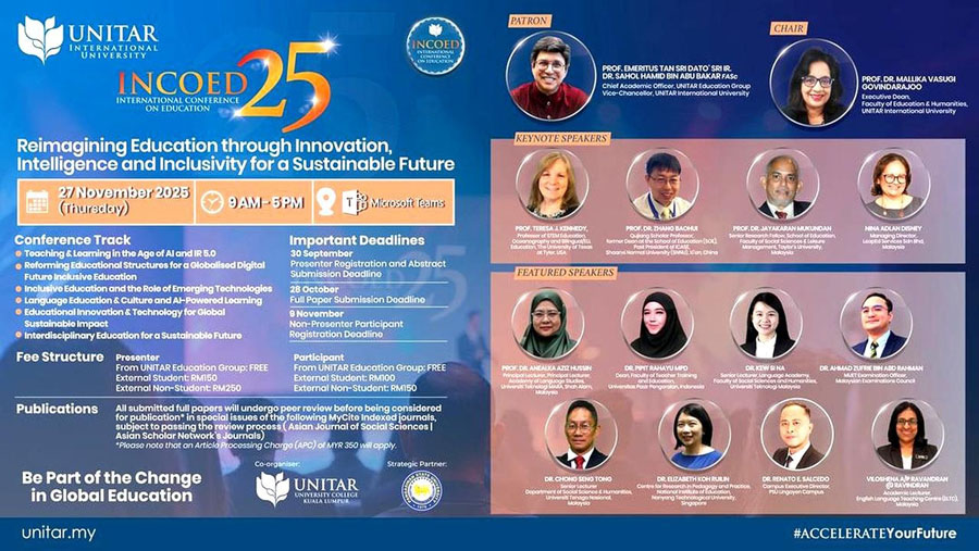 Dia menjelaskan, International Conference on Education (INCOED 2025) ini ditaja oleh Faculty of Education and Humanities, UNITAR Internasional University Malaysia dan University College Kuala Lumpur (UUCKL) dengan membawa tema “Reimagining Education Through Innovation, Intelligence and Inclusivity for a Sustainable Future”.