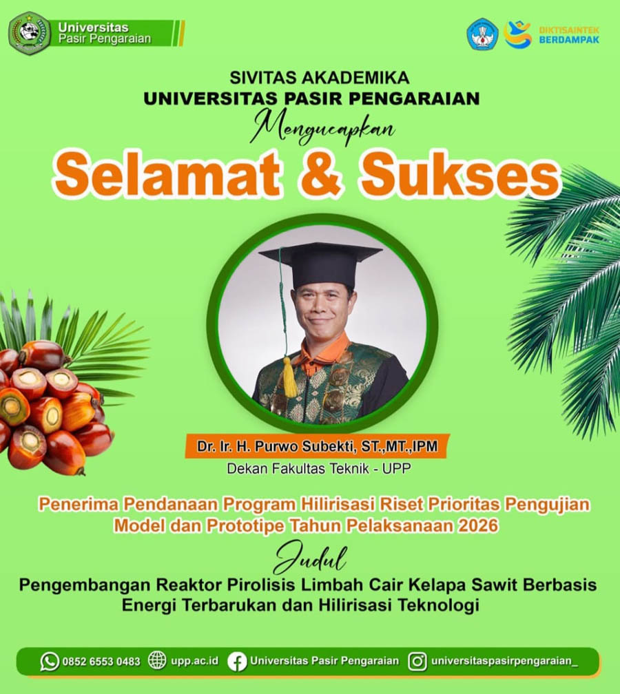 “Kami mengucapkan selamat dan sukses kepada Dr. Ir. H. Purwo Subekti atas keberhasilannya memperoleh pendanaan Program Hilirisasi Riset Prioritas tahun 2026. Ini merupakan prestasi yang sangat membanggakan bagi Universitas Pasir Pengaraian, sekaligus menunjukkan bahwa riset yang dilakukan dosen UPP mampu memberikan solusi inovatif terhadap permasalahan nyata di masyarakat, khususnya dalam pemanfaatan limbah industri kelapa sawit menjadi energi terbarukan,” ujar Hardianto.