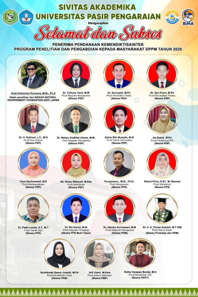 ROKAN HULU – Sivitas akademika Universitas Pasir Pengaraian (UPP) kembali menorehkan prestasi membanggakan di tingkat nasional. Sejumlah dosen UPP berhasil meraih pendanaan dari Kementerian Pendidikan, Kebudayaan, Riset, dan Teknologi (Kemendiktisaintek) Tahun 2026 dalam program Penelitian dan Pengabdian kepada Masyarakat yang dikelola oleh Direktorat Penelitian dan Pengabdian kepada Masyarakat (DPPM).