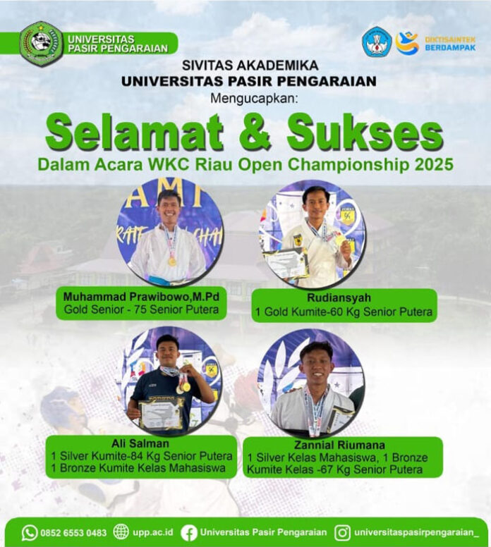 ROKAN HULU – Universitas Pasir Pengaraian (UPP), Kabupaten Rokan Hulu (Rohul), kembali mencatatkan prestasi gemilang di tingkat Provinsi Riau. Dimana Empat atlitnya berhasil meraih beragam medali pada ajang WKC Open Karate Championship 2025 yang diselenggarakan di Pekanbaru, pada Kamis 21 Agustus 2025.