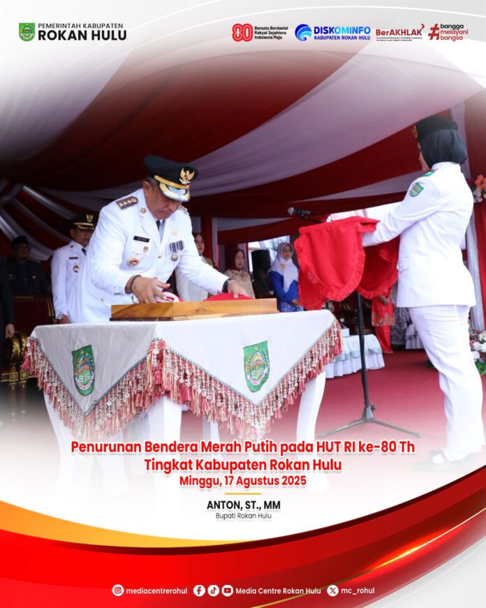 PASIRPENGARAIAN – Dalam rangka Merayakan HUT RI ke 80, Pemerintah Kabupaten Rokan Hulu (Rohul) menggelar Upacara Detik  – Detik Proklamasi di halaman Kantor Bupati Rohul, Minggu (17/8/2025), dengan meriah, Dimana bertindak sebagai Inspektur Upacara Bupati Rohul Anton,ST,MM.