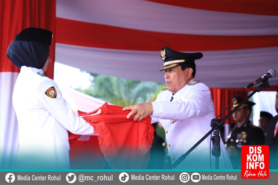 Sementara Petugas Pengibaran Bendera Sang Merah Putih, Danki Pasukan Letda Inf Sutrisno Jabatan Danton SMS Kompi Bantuan Yonif 132 Bima Sakti, Dan Pasukan 8 Petugas Pembawa Baki Pengibaran penjemput Bendera Delmiati Siswa SMAN 1 Ujung Batu, Putri dari Ayah Alm. Uwan dan Ibu Eti, Pengibar Bendera Penarik Tali Muhammad Daffa Budiman Siswa SMAN 1 Rambah Hilir, Putra dari Ayah Husni Budiman, Ibu Akyuni.