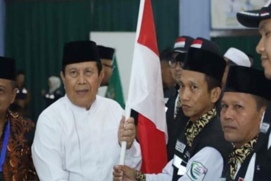 Usai dengan rangkaian sambutan, Bupati Sukiman secara resmi melepas keberangkatan para Jamaah ditandai dengan penyerahan Bendera Merah Putih dilanjutkan dengan ber salam salaman. (Galeri/Diskominfo)