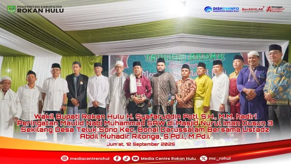 ROKAN HULU – Wakil Bupati Rokan Hulu (Rohul) H. Syafaruddin Poti, S.H., M.M., hadiri peringatan Maulid Nabi Muhammad SAW 1447 H yang dilaksanakan di Masjid Nurul Iman, Desa Teluk Sono, Kecamatan Bonai Darussalam, Jumat (12/09/2025).